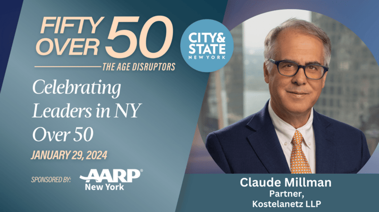 NEW YORK (January 29, 2024) — Kostelanetz partner Claude Millman has been selected to City & State’s Fifty Over 50 list honoring “the contributions and legacies of fifty venerable New Yorkers,” according to City & State. The awards are also sponsored by AARP NY.